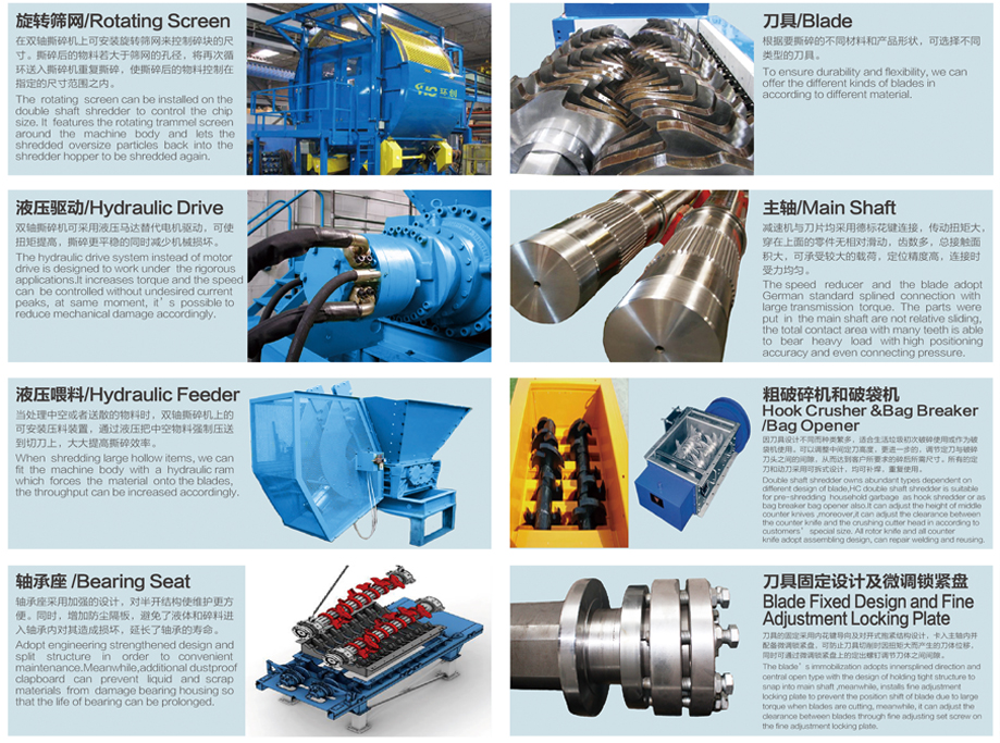 環(huán)創(chuàng)DS系列雙軸撕碎機可滿足各行業(yè)的廢料回收要求,適合撕碎較厚難碎的物料如:電子垃圾、硬質(zhì)塑料、金屬、木材、廢舊橡膠、包裝桶、托板等。可回收材料種類繁多,經(jīng)撕碎后的物料可直接回收或根據(jù)需求作進一步細(xì)化處理。適用于工業(yè)廢棄物回收、醫(yī)療回收、電子制造、托板制造、木材加工、生活垃圾回收、塑料回收、輪胎回收、造紙等行業(yè)的應(yīng)用。該系列雙軸撕碎機擁有低速、大扭矩、低噪音等特點,采用西門子編程系統(tǒng),可以自動控制、設(shè)有啟動、停止、反轉(zhuǎn)以及超載自動反轉(zhuǎn)控制功能。
